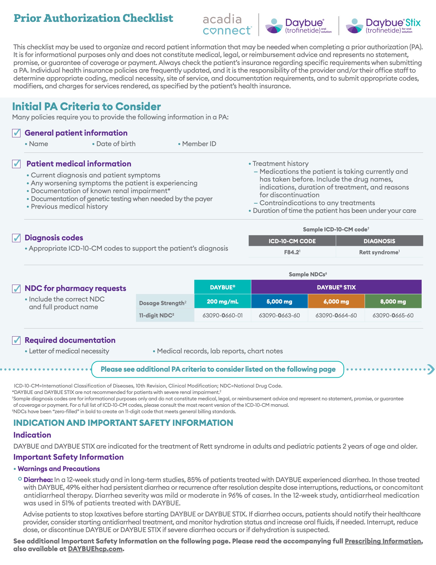 A guide with information on accessing DAYBUE or DAYBUE STIX and receiving coverage support (eg, help with prior authorizations and appeals) through Acadia Connect.
