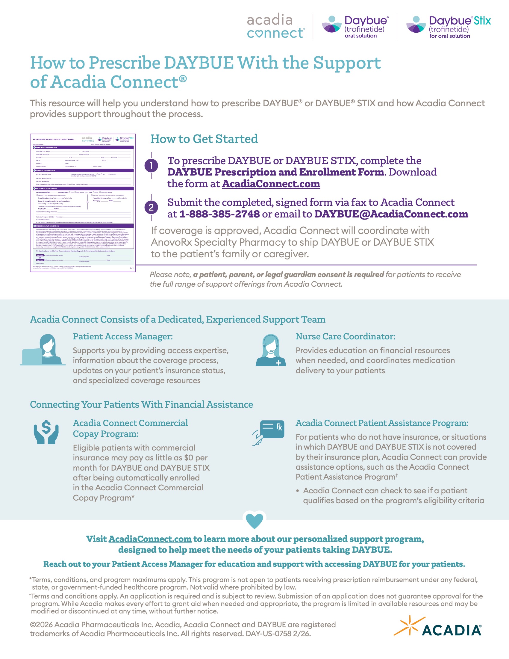 Form used to prescribe DAYBUE to your patients and enroll them in Acadia Connect (with consent from the parent/legal guardian).
