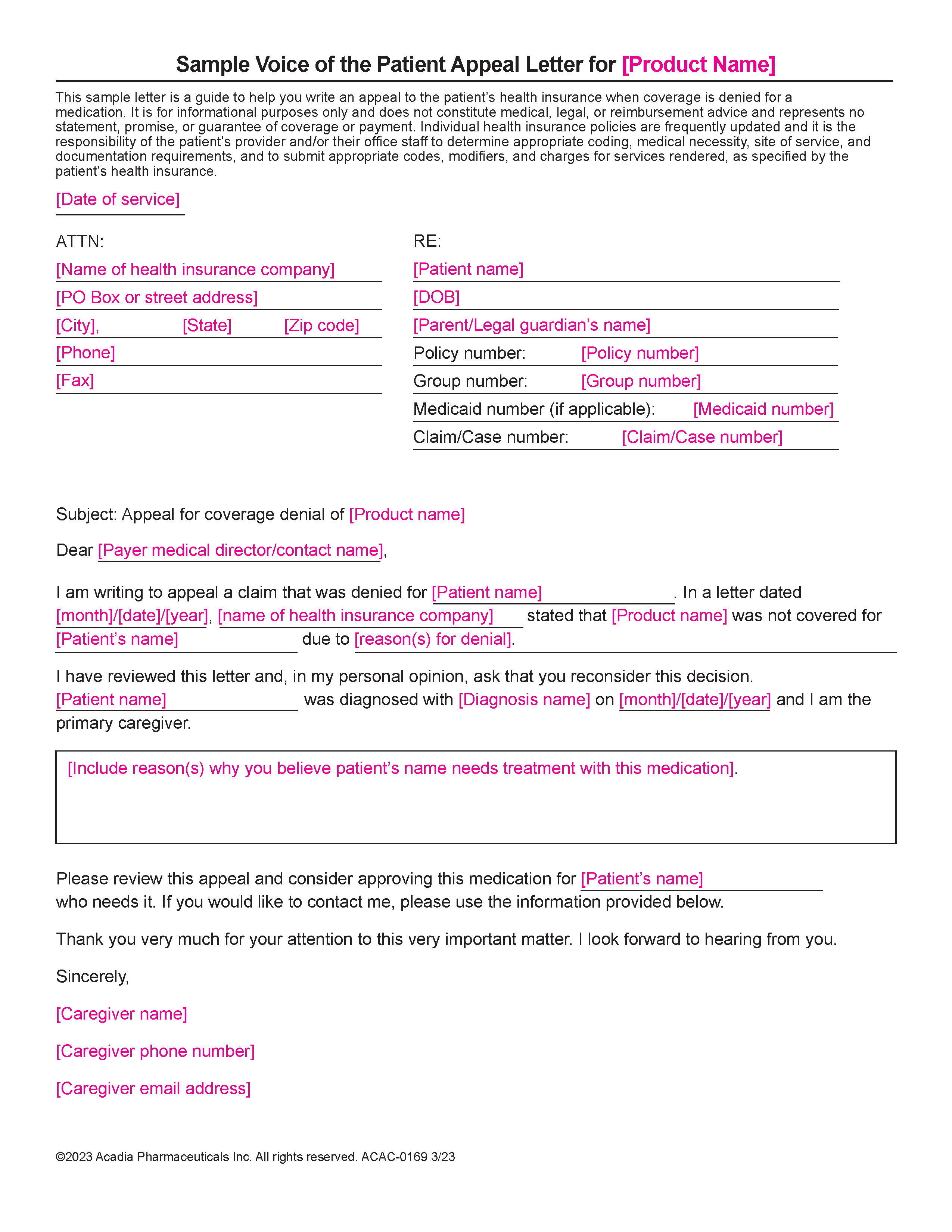A letter template for your patient’s caregiver to request a reversal of the health plan’s coverage denial for DAYBUE or DAYBUE STIX.